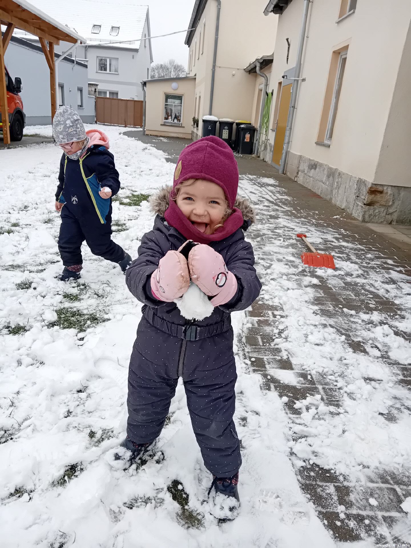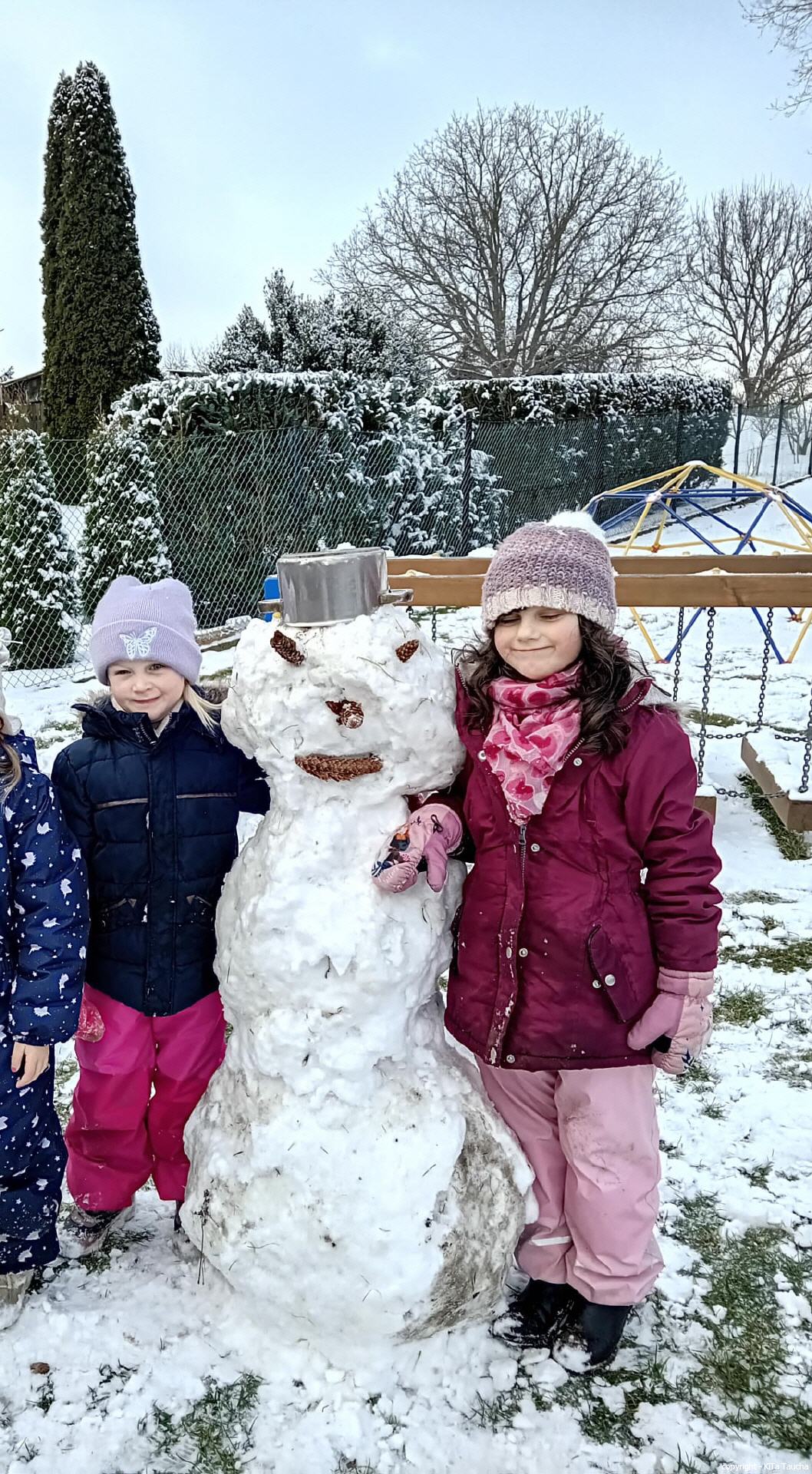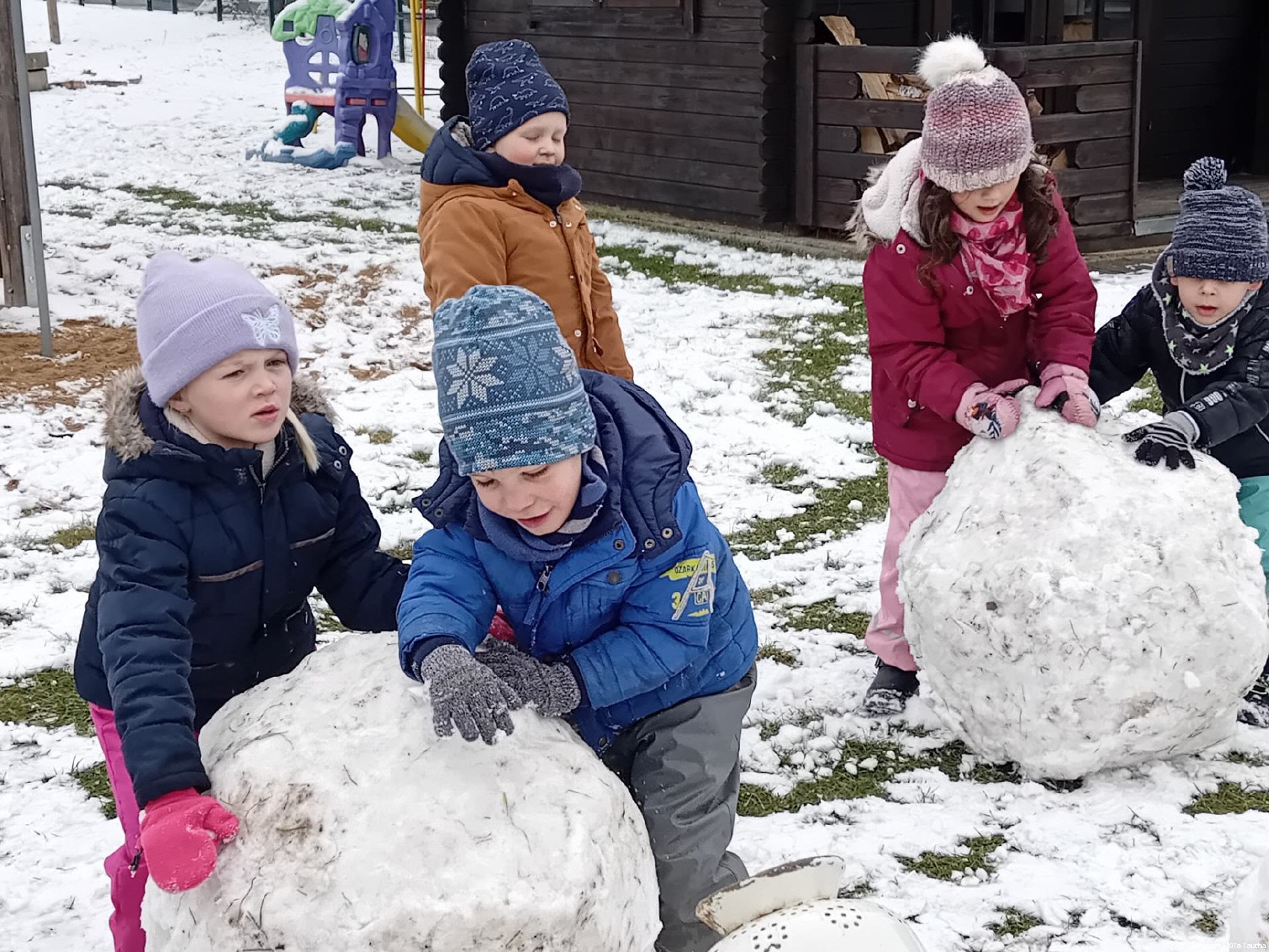 Mit vereinten Kräften rollten die Kinder den Schnee zu Kugeln und bauten eine Schneefamilie |