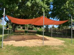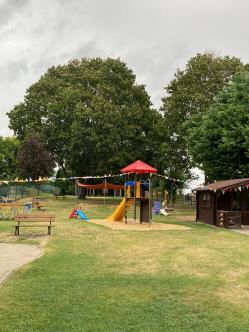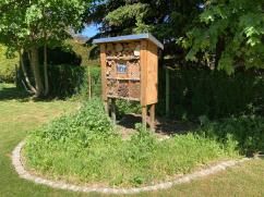 Auf unserem Außengelände finden die Kinder den Funktionsraum die "Werkstatt". Neben der Werkstatt gibt es einen Schuppen, in dem Fahrzeuge u.a. Spielsachen stehen. Eine große Überdachung bietet uns die Möglichkeit Angebote auch geschützt (vor Regen oder Sonne) im Freien durchzuführen. Ansonsten können sich die Kinder auf unserer großzügigen Außenanlage (mit verschiedenen Klettergerüsten, Schaukel, Sandkasten,...) frei bewegen, ihren Bewegungsdrang stillen, die Umgebeung erforschen und mit unser angelegten Bienenwiese und unserem Insektenhotel hier vor Ort die Natur (Pflanzen, Insekten und Krabbeltiere) hautnah erleben.