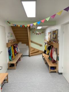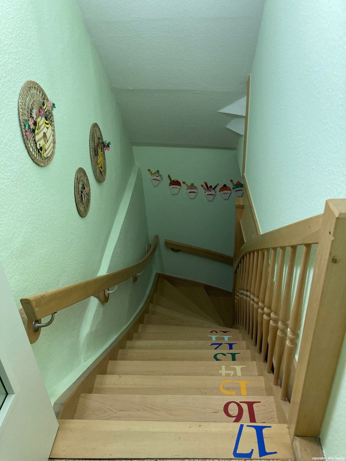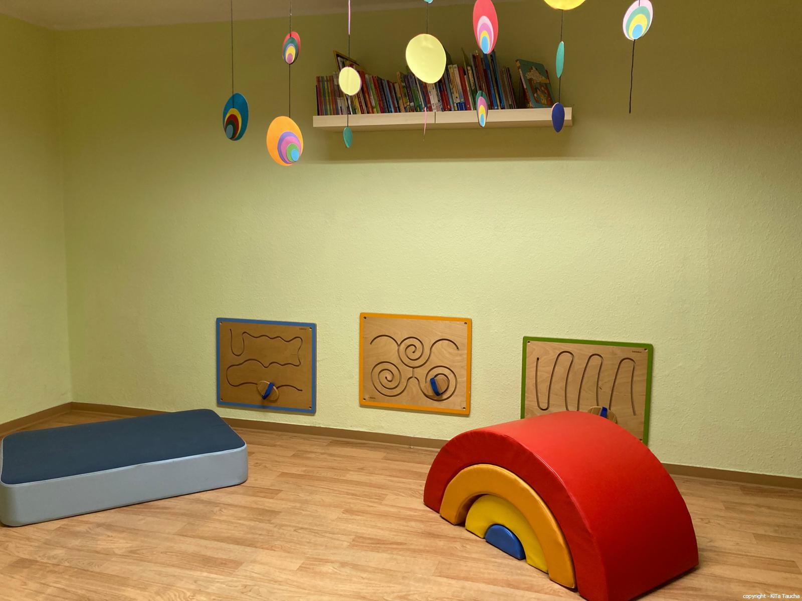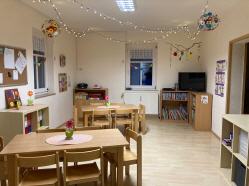 In der ersten Etage haben die Kinder weitere zwei Räume und einen Flur, in denen sie verschiedene Bildungsecken vorfinden. Sie können sich für unterschiedliche Angebote entscheiden oder ihren eigenen Interessen nachgehen. Die Ältesten können zur Mittagszeit hier Mittagsruhe halten.