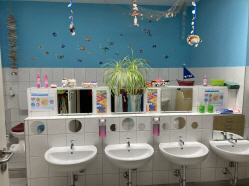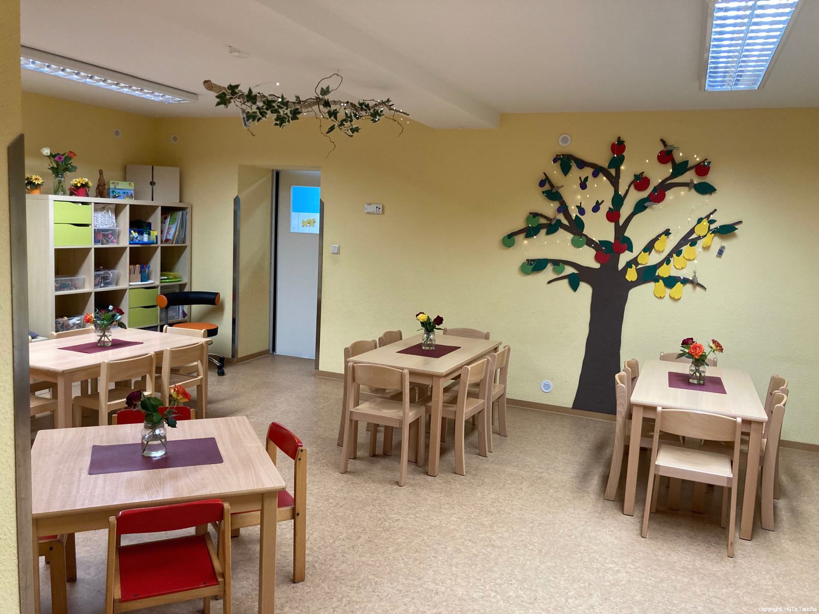 Im Haus haben wir im Erdgeschoss einen großen Raum für die Nutzung von Tagesangeboten, sowie für die Einnahme der Mahlzeiten (Kinderrestaurant) und gemeinsamen Festen und Feiern. Zwei kleinere Räume stehen ebenfalls für die Kinder zur Verfügug. Diese dienen vorzugsweise unseren Jüngsten als Rückzugsmöglichkeit. Weiterhin befinden sich ein großer Waschraum und ein Flur mit Garderobe im unteren Bereich.